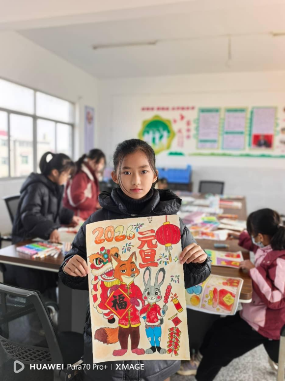 绘画现场,孩子们化身“小画家”,铺开画纸、拿起画笔,尽情发挥想象力。有的以“欢庆元旦”为主题,用鲜艳的色彩描绘出红灯笼、烟花、福字等元素,画面充满节日的热闹气息;有的聚焦“校园新生活”,勾勒出与同学嬉戏、和老师互动的温馨场景,笔触间满是童真童趣;还有的将传统文化融入创作,把十二生肖、传统服饰等元素与元旦祝福相结合,让画作兼具美感与内涵。一张张画作色彩斑斓、创意十足,每一笔都饱含着孩子们对新年的美好期盼。