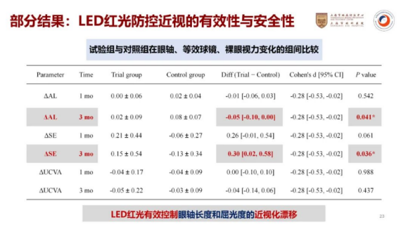 上海市眼病防治中心开展了一项单中心、随机对照的“LED红光控制近视进展”预实验,研究纳入40名8-12岁单纯性近视儿童,分为干预组和对照组,每组各20人。干预组接受鹰瞳PBM®视力康复仪照射(2次/日,3分钟/次),对照组采用极低剂量照射(0.001mW,模拟安慰剂)。