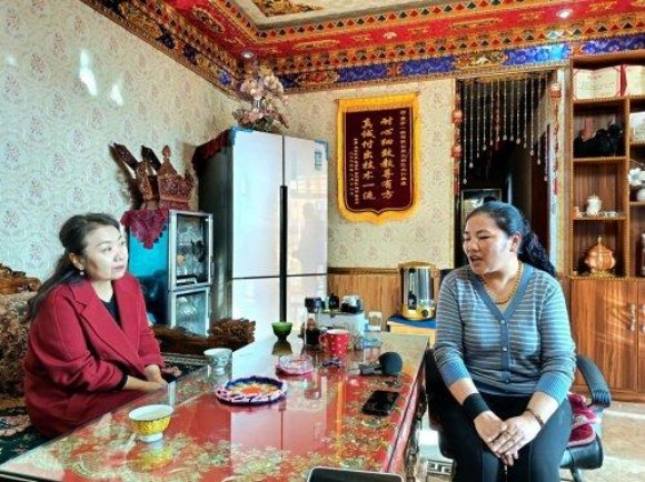 现居村里的小马,就是当年搬迁的牧民。在长江源村驻村第一书记梁亮的带领下,敲开了小马家的门。她的脸上洋溢着笑容,热情大方,说起话来格外爽朗。走进她家宽敞明亮的客厅,藏式花纹的家具与冰箱、电视等现代家电和谐地摆在一处,阳光透过玻璃窗洒进来,在地板上织出斑驳的光影。