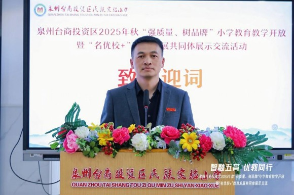 开幕式上,泉州台商投资区民族实验小学党支部书记、校长陈东旭致欢迎词,系统阐述了学校“五育并举、三融育人”的办学理念,分享了“民族花儿开,朵朵放光彩”的育人实践。他强调,本次开放活动不仅是学校教学成果与改革成效的集中展示,更是区域“名优校+”教育发展共同体互学共研、协同发展的重要契机。期待与各校同仁以此平台为纽带,深化交流,凝聚合力,共同迈向“各美其美,美美与共”的教育发展新境界。