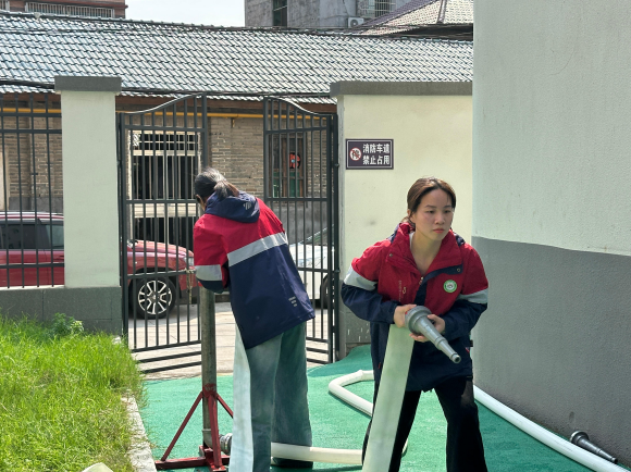 在实操环节,教职工们分组进行了消防技能训练。大家严格按照操作规范,认真学习并实操了灭火器“提、拔、握、压”使用方法,面对模拟火情,沉着冷静、动作规范,成功将火源扑灭,切实掌握了初期火灾扑救的实战技能。同时,教职工们还进行了消防水带的连接与出水实操训练,从水带的铺设、接口的连接到水枪的握持与喷射,每一个步骤都反复练习、熟练掌握,有效提升了协同作战与应急处置能力。