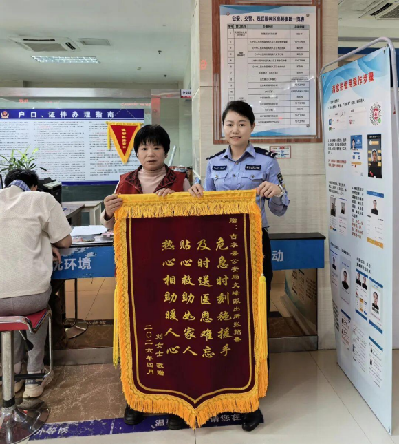 刘女士住院及康复期间,张招香多次通过电话关心其身体恢复情况。身份证到证后,张招香第一时间送证上门,将证件交到刘女士手中。康复出院后,刘女士专程来到窗口,送上一面写有“危急时刻施援手,及时送医恩难忘;贴心救助如家人,热心相助暖人心”的锦旗,对公安窗口工作人员在危急时刻的及时救助和后续关怀表示感谢。