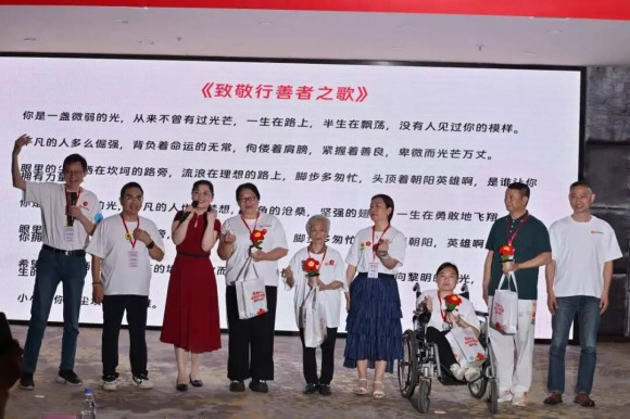 年会最庄重也最温暖的时刻,莫过于“致敬行善者”环节。四位行善者代表——用28年光阴守护“星星的孩子”的“月亮婆婆”胡惠月;坚守西南边陲26年,帮扶山区困境妇女儿童的张琴;替27位牺牲战友照顾父母30余载的退伍老兵董贵生;坐着轮椅直播带货助残、助学的“青蛙公主”杨敏一一走上舞台,分享自己的行善故事与心声。